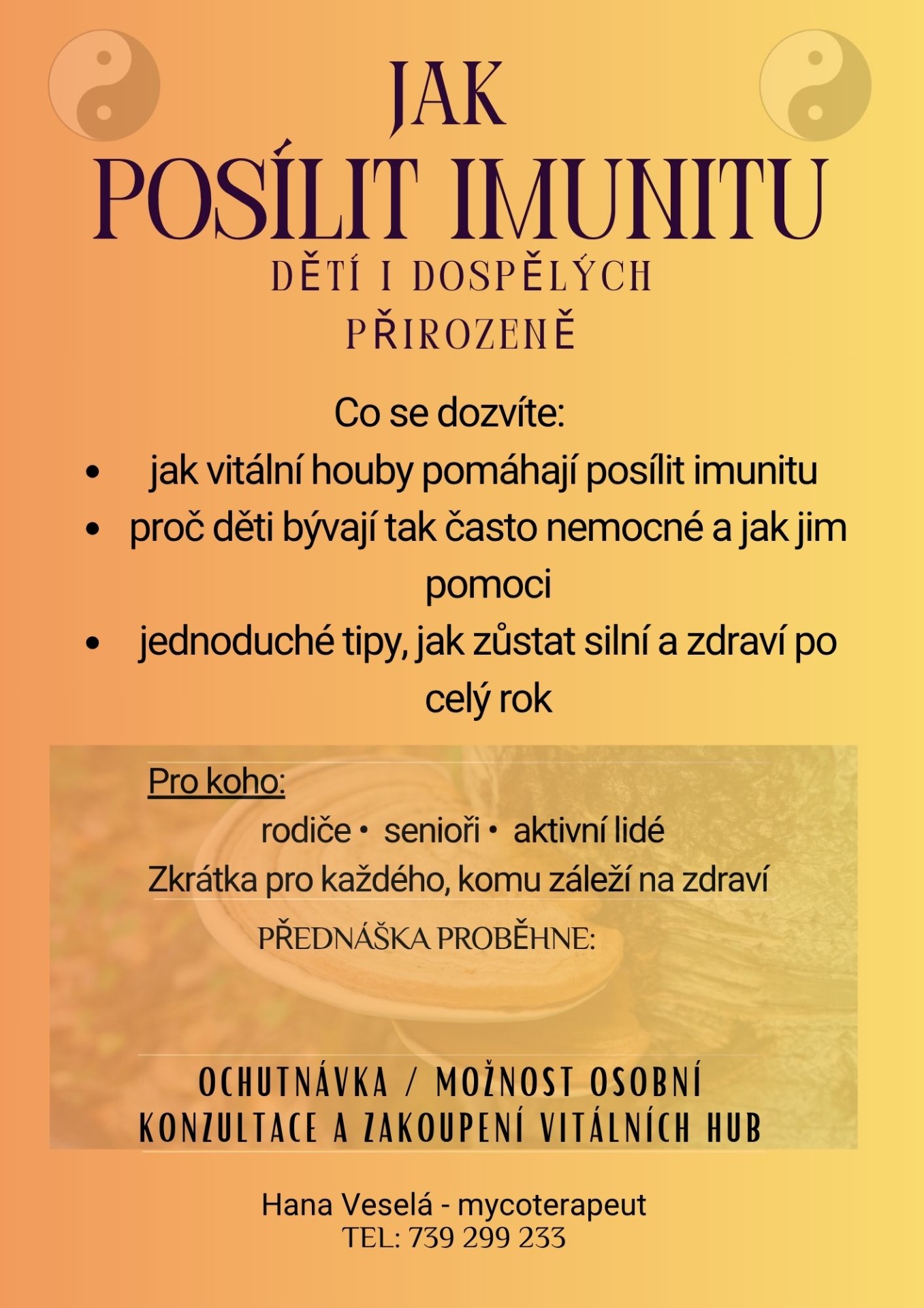 Pomáhám lidem objevovat, jak mohou vitální houby a vědomá péče o tělo zlepšit zdraví, imunitu i psychickou pohodu – prostřednictvím konzultací a přednášek.